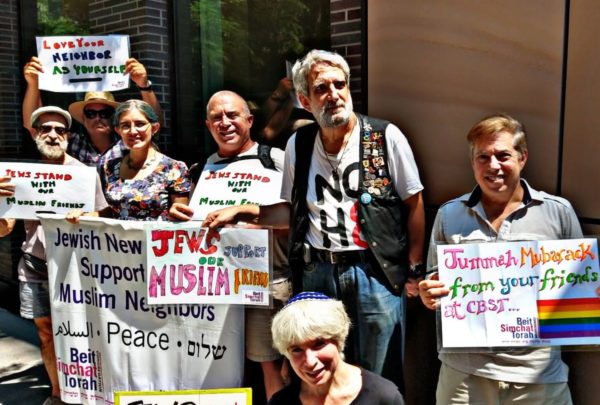 Auf dem Foto seht Ihr Rick Landman (ganz rechts) und weitere Mitglieder der Beit Simchat Torah Synagoge, in der Nähe der New Yorker Universität. Seit Trump Präsident geworden ist, demonstrieren sie gegen Hass, Rassismus und Muslimfeindlichkeit vor ihrer Synagoge. Es ist eine LGBTIQ-Gemeinde, 1973 gegründet, mit etwa 3600 Mitgliedern. 1979 haben sie am ersten Gay Rights March in Washington teilgenommen.